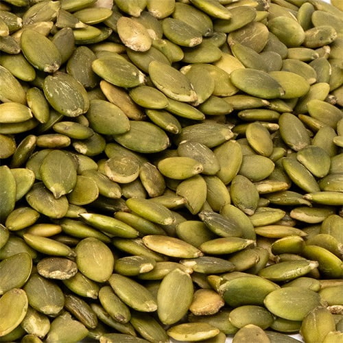 Pumpkin seeds are edible seeds that grow inside pumpkins. They are typically flat and oval-shaped, with a white outer husk. After the husk is removed, the seeds are light green in color. Some pumpkin cultivars are huskless, and are grown only for their edible seed.